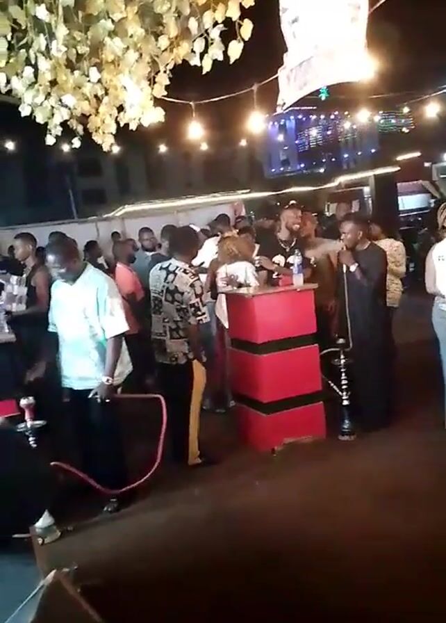 crowded outdoor event at night. People are milling around tables and a red and black pillar that seems to be a focal point. Some people are holding drinks. There are hookahs present. The area is decorated with string lights and artificial foliage overhead. A speaker can be seen in the foreground. Music is playing in the background.