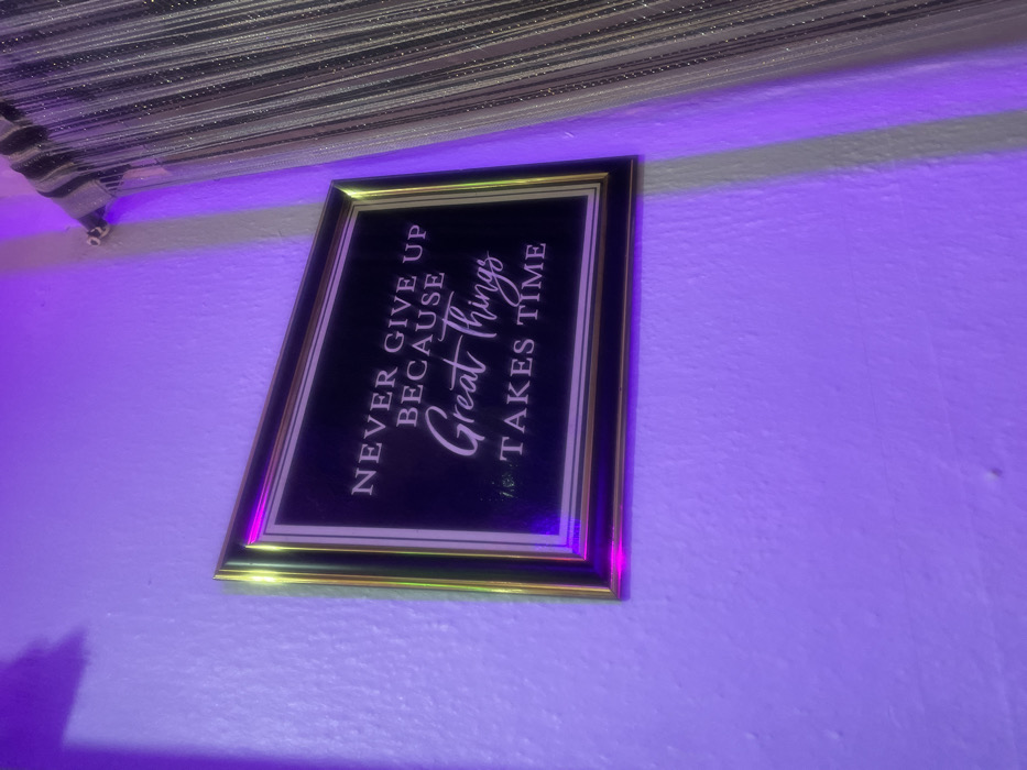 A framed print hangs on a textured, light purple wall beneath what appears to be a metal venetian blind. The frame is black with a thin gold border. The print inside reads, "Never give up because great things takes time." The lighting in the room is predominantly purple.