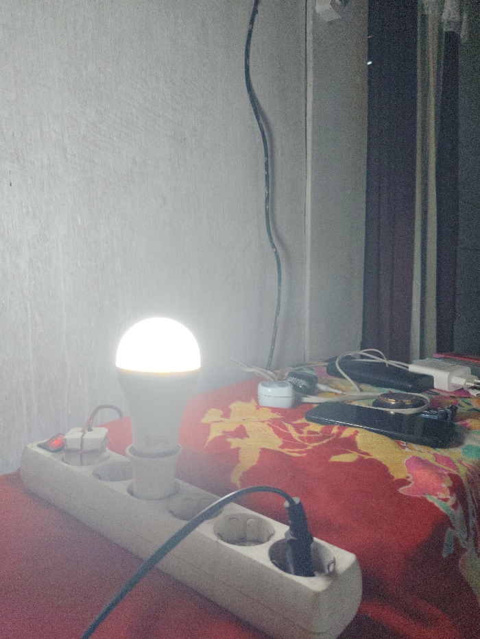 A bright light bulb glows atop a white power strip plugged into an outlet. The power strip rests on a red and yellow patterned surface, possibly a bedspread. Various electronic devices and chargers are scattered nearby. A black cord snakes down the wall behind the light. Curtains are partially visible to the right. The walls are light-colored and slightly textured.