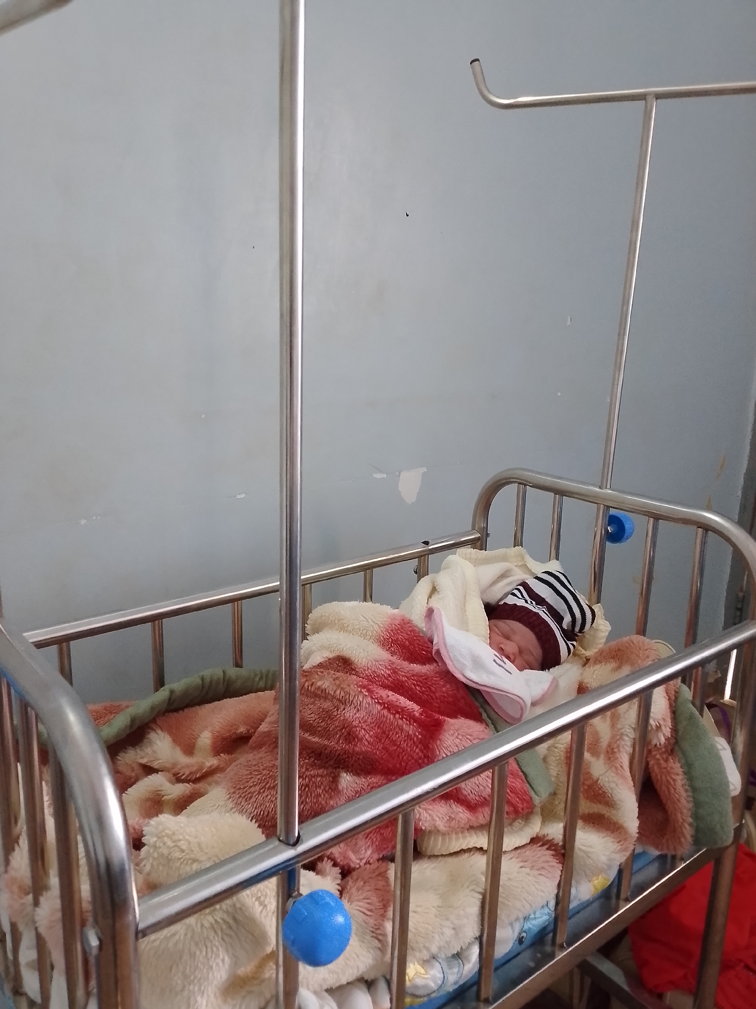 The image displays an infant sleeping in a metal crib within an indoor room in Sabon Tasha, Nigeria. The infant, wearing a striped and burgundy knit cap, is covered by several blankets, including a cream-colored fuzzy blanket and a red and cream patterned fuzzy blanket. The crib is constructed of shiny metal bars and rails, with two blue plastic spherical caps visible on the crib frame. A metal IV pole stand is partially visible on the right side of the frame. The background features a plain light blue-grey wall with visible stains and minor surface damage.