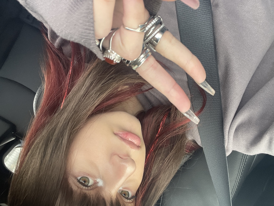 The image depicts a female individual situated within a vehicle in Hod HaSharon, Israel. The subject, appearing to be a young adult, is visible from the chest up, with her head tilted to the right and her light-colored eyes looking directly forward. Her dark brown hair is styled with bangs and contains distinct red streaks and fine red tinsel strands. She is dressed in a grey long-sleeved garment, and a black seatbelt is visible across her chest and left shoulder. Her right hand is raised near her face, forming a V-sign (peace sign). This hand is adorned with multiple silver-toned rings on various fingers, notably an ornate ring with a large, orange-red stone on her right ring finger. Her fingernails are long, clear, and artificial, shaped in a stiletto or coffin style. The immediate background shows dark car interior elements, including dark seat upholstery.