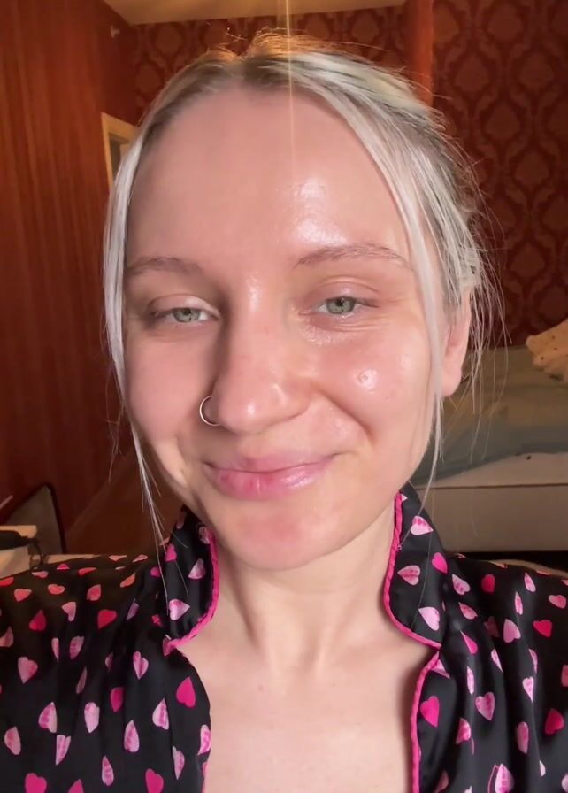A woman in black and pink heart-patterned pajamas is standing indoors, filming a selfie video. She has fair skin, blonde hair pulled back, and a nose ring. She smiles slightly at the camera. The video begins with a view of her bedroom. The camera then pans to the right, showing a view through a window. Outside, there are several apartment buildings and a grassy area. A white van with a red container attached is visible. It is a grey, overcast day.