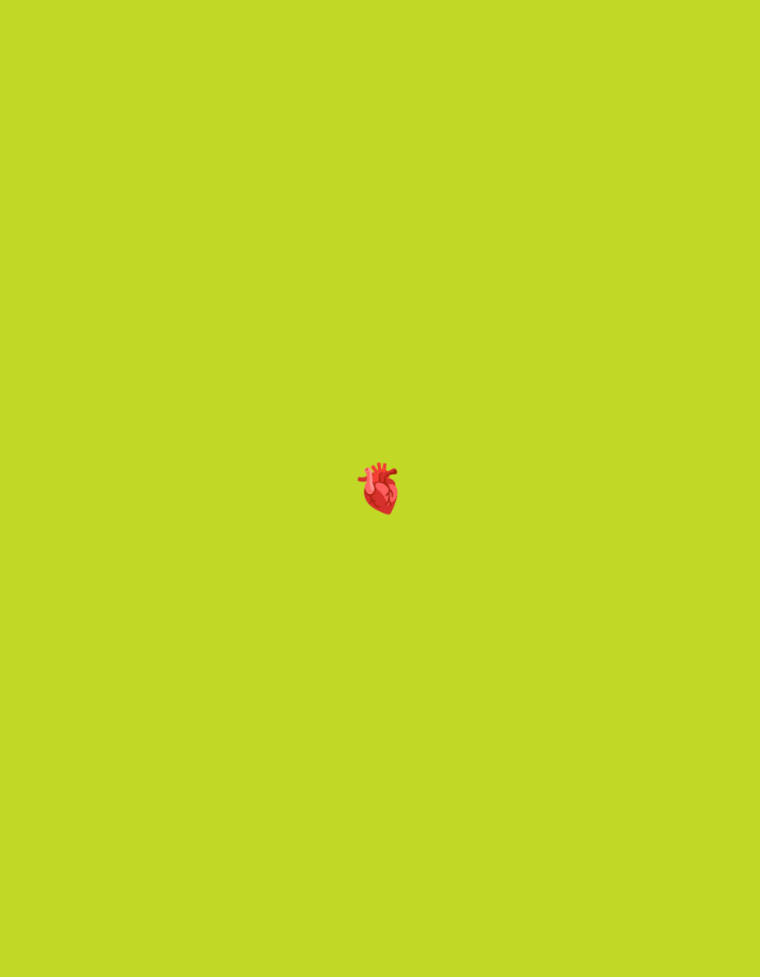 A single red cartoon heart is centered against a solid chartreuse background. The heart is detailed with major vessels and texture. The background fills the majority of the frame, emphasizing the heart as a singular, isolated element. The overall image is minimalistic and bright.