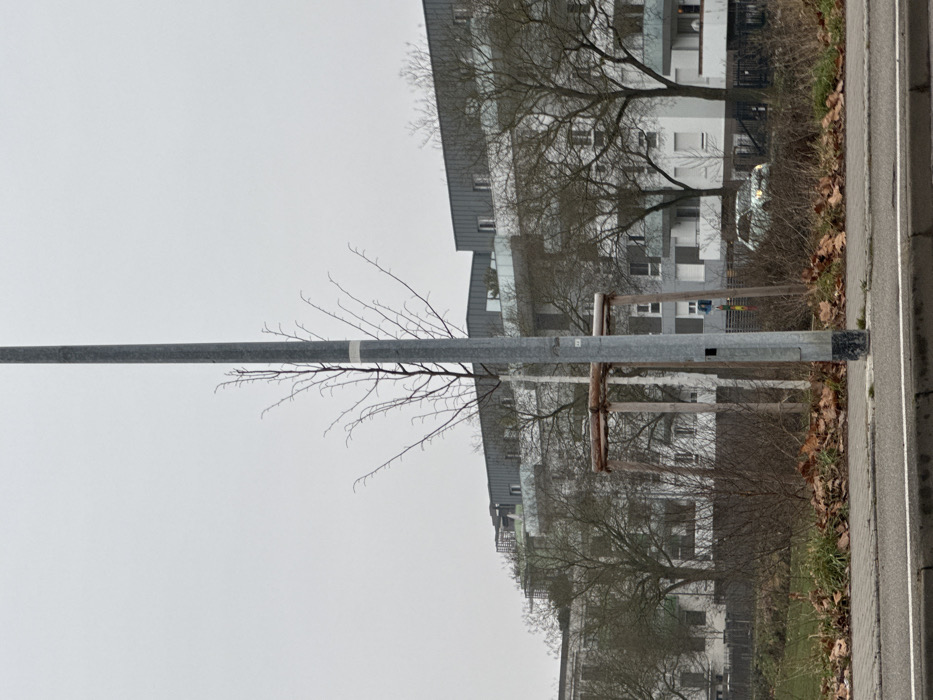 This image depicts an urban landscape in Oberhausbergen, France, under an overcast sky. In the immediate foreground, a paved sidewalk with a visible curb borders a road, which is partially visible at the bottom. The sidewalk and an adjacent unkempt grassy area are covered with scattered brown, dry leaves. Centrally positioned, a tall, slender grey metallic pole, possibly a lamppost, stands vertically. To the right of the pole's base, a small square opening is present. Behind the pole and slightly to its left, a young deciduous tree with slender, bare branches extends upwards, partially obscured by the pole. This tree is supported by a robust, square-shaped wooden frame structure composed of four vertical posts and horizontal crossbeams. Behind the foreground elements, a strip of unkempt ground features dry grass and bare shrubs. Further back, several larger deciduous trees with bare branches are visible. In the background, a series of modern, multi-story apartment buildings with white facades, grey rooftops, and grey balconies are visible. One light-colored vehicle, possibly white or silver, with illuminated headlights, is partially visible behind the shrubs and trees in the mid-ground, positioned in front of the apartment buildings. No individuals are present in the scene.