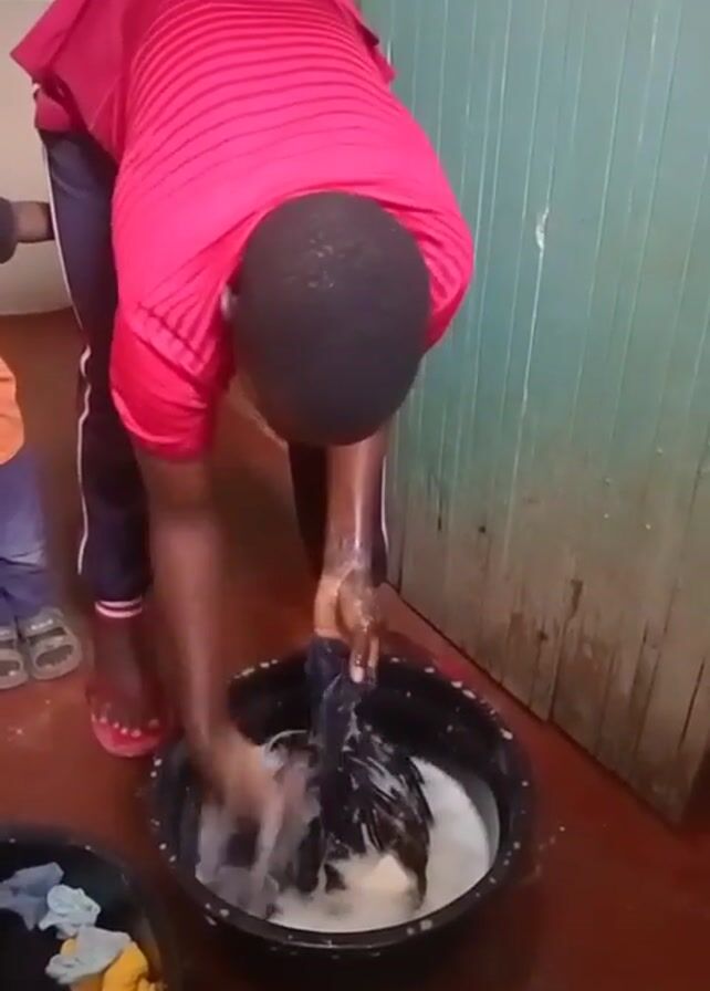 In a brightly lit indoor setting, a person wearing a red shirt and dark pants with white stripes is hand-washing dark-colored clothes in a black bucket filled with soapy water