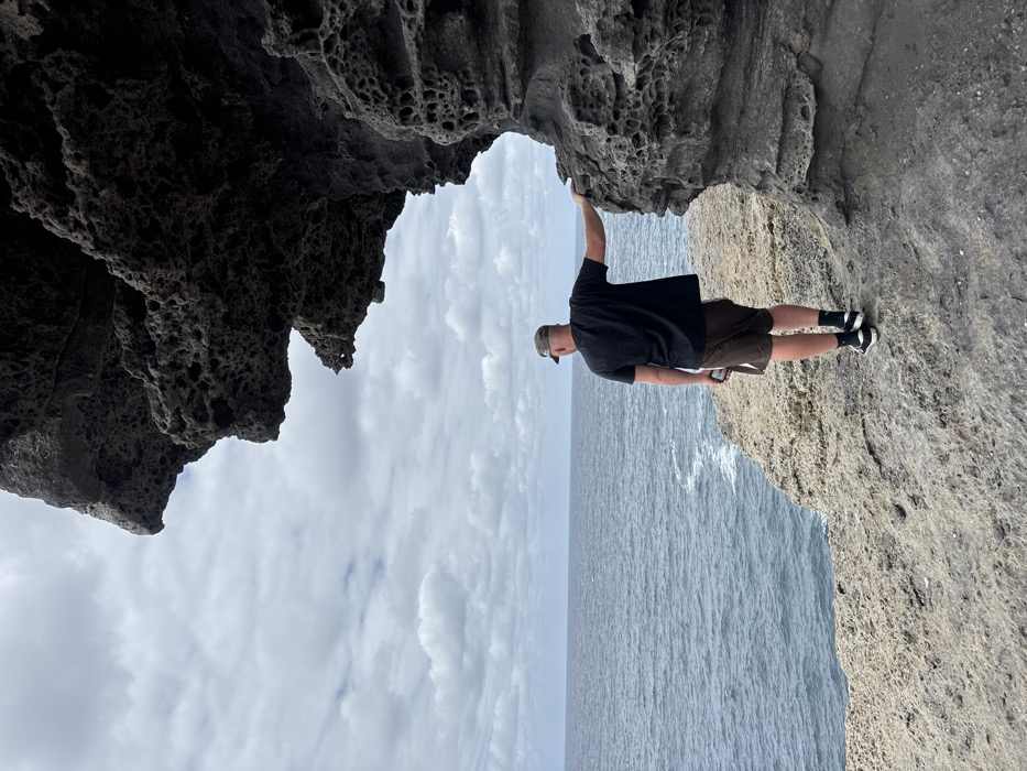 A man in a dark shirt, khaki shorts, and a baseball cap stands on a rocky ledge overlooking the ocean. He holds onto a jagged rock formation overhead. The sky, partly cloudy, is visible between the rock and the ocean. The rock formation has a dark, porous texture. The man appears to be posing for a photo.