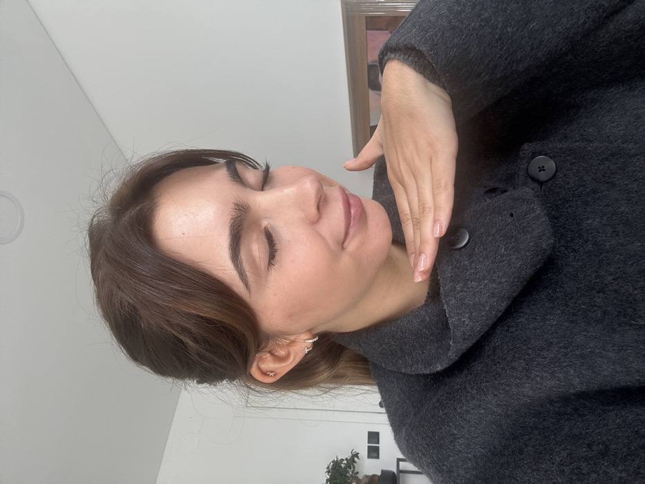 A light-skinned female individual is depicted in a head and upper torso shot within an indoor setting. Her medium brown hair is styled with bangs framing her face and the rest appears partially pulled back. Her eyes are closed, and her head is slightly tilted downwards. She exhibits subtle facial makeup, including a rosy blush on her cheeks and a natural lip color. The visible left ear has multiple piercings: a helix piercing with a small star-shaped stud, a tragus piercing with a small stud (possibly the letter 'T'), and a lobe piercing with a small hoop earring adorned with stones. She wears a dark gray, textured coat featuring prominent black buttons on the front and a folded collar. Her right hand, with nails manicured in a clear or light pink polish, is placed horizontally under her chin/jawline, palm flat against her neck and the coat collar. The background consists of a plain white wall. To the left, a small bonsai-style plant in a dark pot rests on a dark surface. To the right, a reflection shows a partial wooden frame or mirror edge. The scene is illuminated by bright, diffused lighting. The specific location within Torres Vedras, Portugal, cannot be determined from the visual evidence presented in the image.