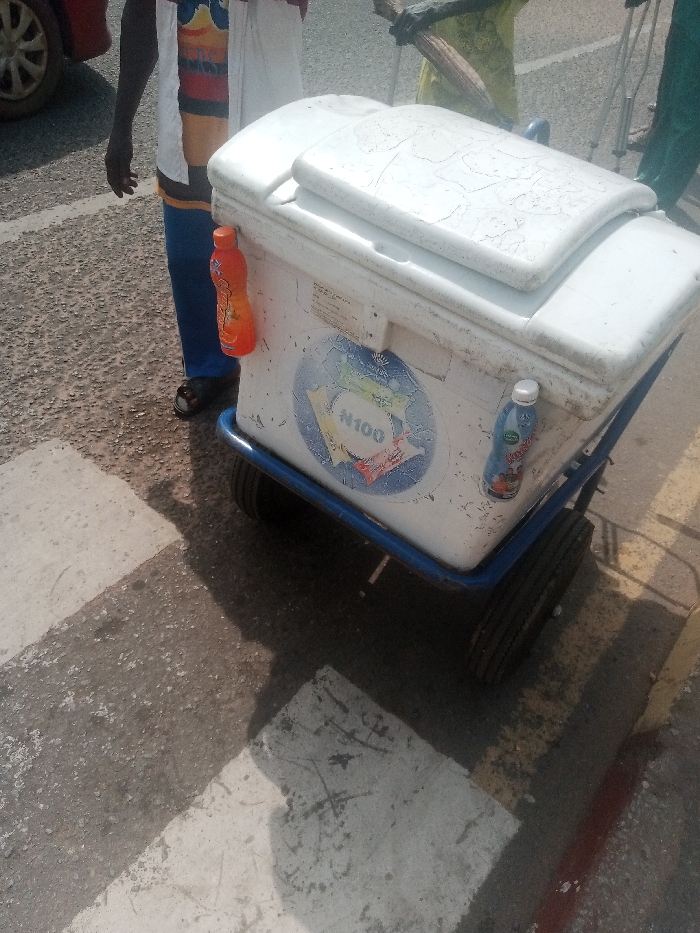An outdoor scene in Ibadan, Nigeria, shows a white insulated cooler on a blue-framed, two-wheeled pushcart positioned on an asphalt surface