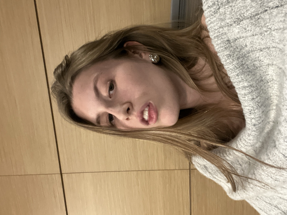 The image displays a close-up portrait of a female individual in an indoor environment. She possesses long, light brown hair, fair skin, and is looking directly towards the camera. Her lips are slightly parted, revealing her upper teeth. Her right eye (viewer's left) is partially closed, while her left eye (viewer's right) is open. She wears a light gray, off-the-shoulder, cable-knit sweater. A single silver-toned, spherical stud earring is visible on her right earlobe (viewer's left). The background consists of a light wood-paneled wall with horizontal and vertical seams. A dark gray object or surface is partially visible behind her right shoulder. The specific location within Mexico City, Mexico, is not discernible from the visual information presented.