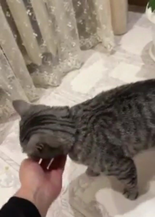 A hand pets a gray tabby cat. The cat is standing on a patterned tile floor. In the background there is a curtain, a potted plant, and a red and white soccer ball.