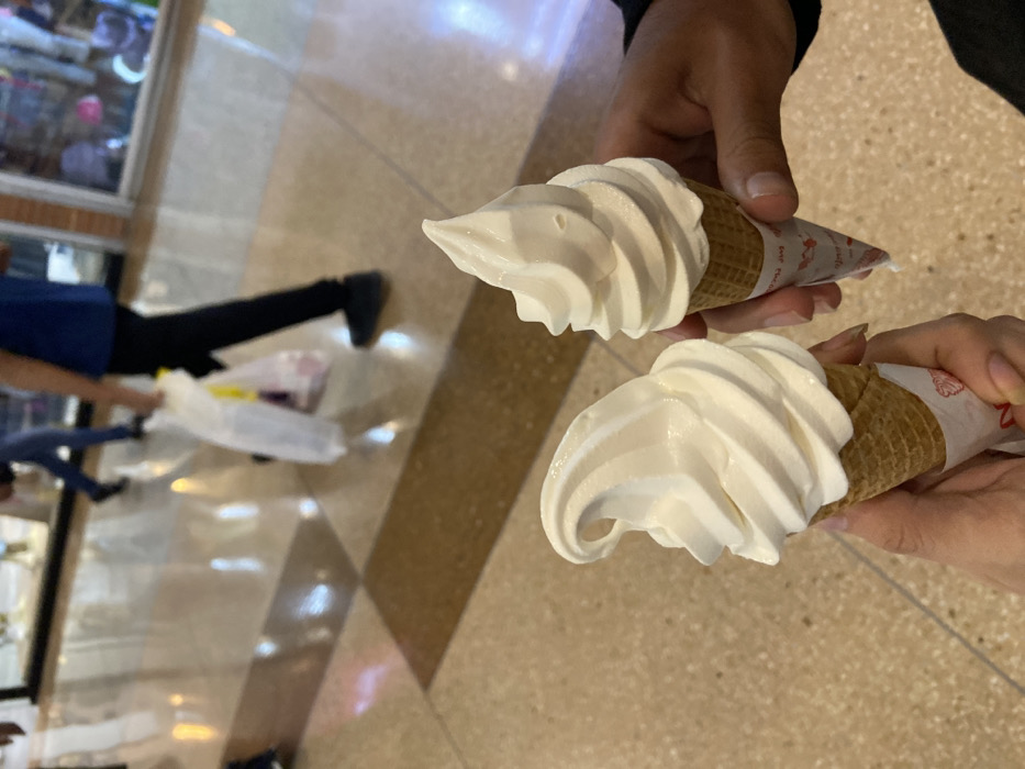 Two people each hold a soft-serve ice cream cone. The ice cream is white, swirled high on a waffle cone. One person has darker skin, the other has lighter skin with visible nails. They are standing on a tiled floor, presumably in a public space. A person with shopping bags is visible in the blurry background. A store display is also reflected.