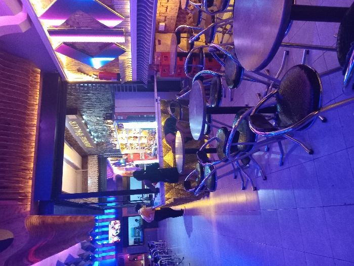 The scene is a dimly lit bar in Eldoret, Kenya, located at latitude 0.482, longitude 35.264. The bar is decorated with neon lights and a large, ornate, golden-colored sculpture. There are several tables and chairs spread across the floor, with a few occupied by patrons. A bar counter runs along the back wall, with "Johnnie Walker" signage visible above it. Bottles of alcohol are on display behind the counter. Two people are standing near the bar counter, while a person is seated at a table nearby. The floor is tiled and illuminated by purple and blue lights, which create a vibrant atmosphere.