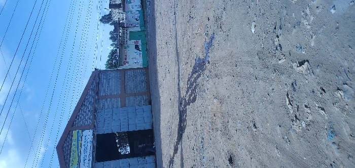 The image depicts an outdoor scene in the city of Oloolua ward, Kenya, under a clear blue sky crisscrossed by multiple overhead power lines