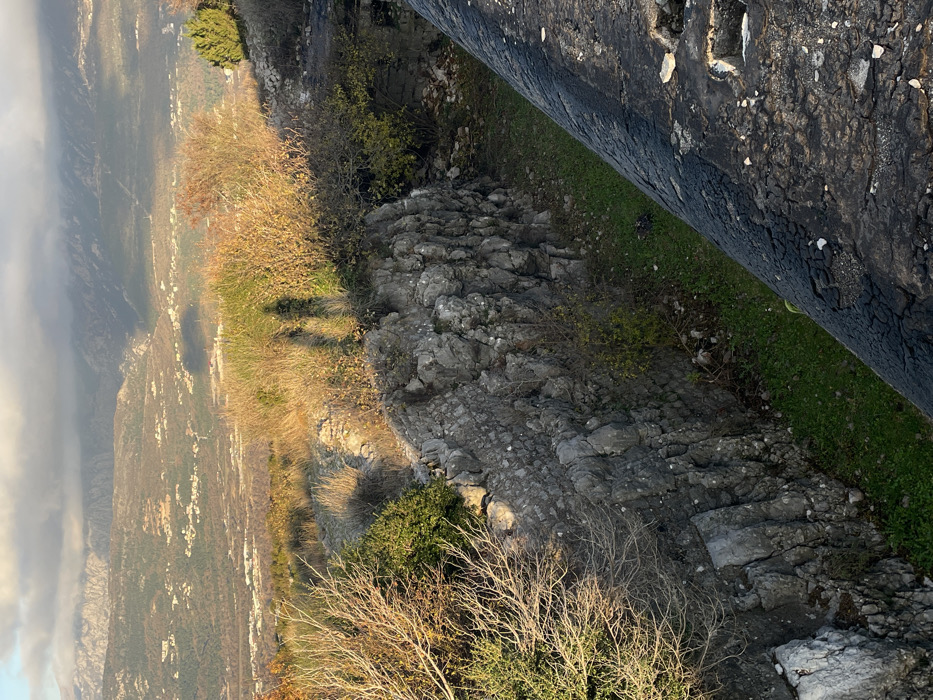 The image displays an elevated view of an archaeological or historical site located in Dubravcevina, Montenegro. The foreground on the right features a dark, heavily textured, and weathered surface, possibly a paved path or remnant of a structure, which runs diagonally from the lower right upward towards the center. To its left lies a deep trench or ditch with a flat, green grassy bottom. The left side of this trench is defined by a robust wall constructed from irregular grey stone blocks, showing signs of age and natural erosion. Above this stone wall, on an elevated section of ground, sparse dry grass and small, autumnal bushes with some bare branches are visible. Two distinct, elongated human shadows are cast onto these bushes and dry vegetation, suggesting the presence of two individuals standing to the right and slightly out of frame, illuminated by a low-angle sun. Beyond the immediate foreground, the landscape extends into a broad valley featuring rolling hills covered in sparse vegetation and scattered small buildings or settlements. In the far background, rugged mountains rise, their peaks partially obscured by light, broken clouds. The overall scene is illuminated by sunlight, creating areas of light and shadow across the terrain, indicating either early morning or late afternoon.