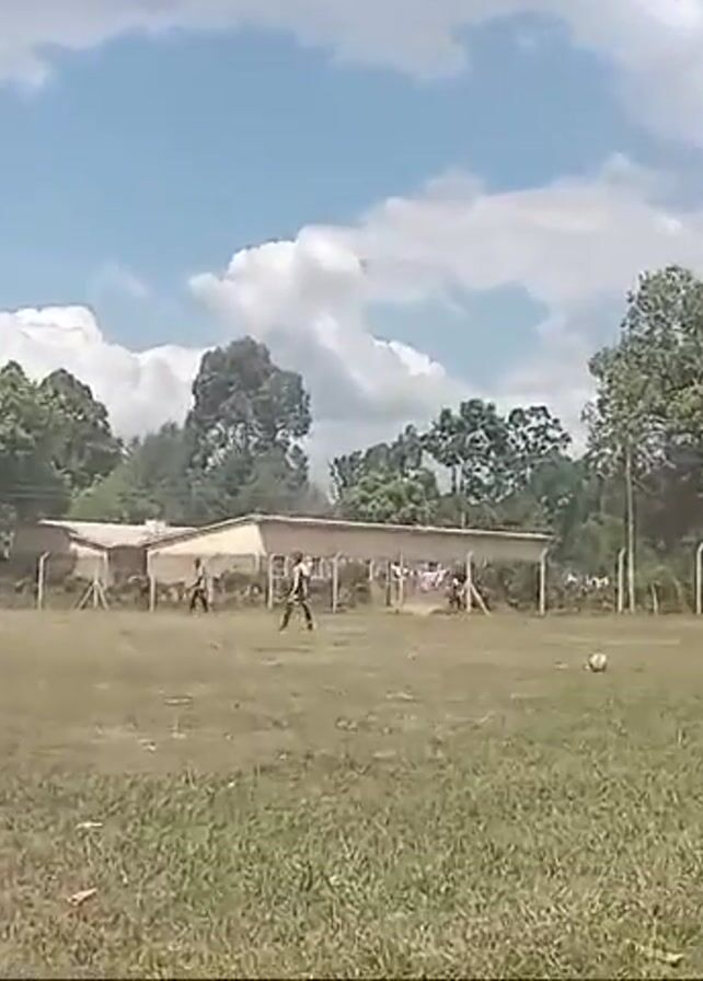 soccer game on a grassy field. There are two teams of players in white and blue/green uniforms. A referee in a yellow vest is also present on the field. The players are spread out across the field, running and kicking the ball. A goalpost is visible at one end of the field. In the background, there are trees and a building. The sky is blue with white clouds. The camera is static.