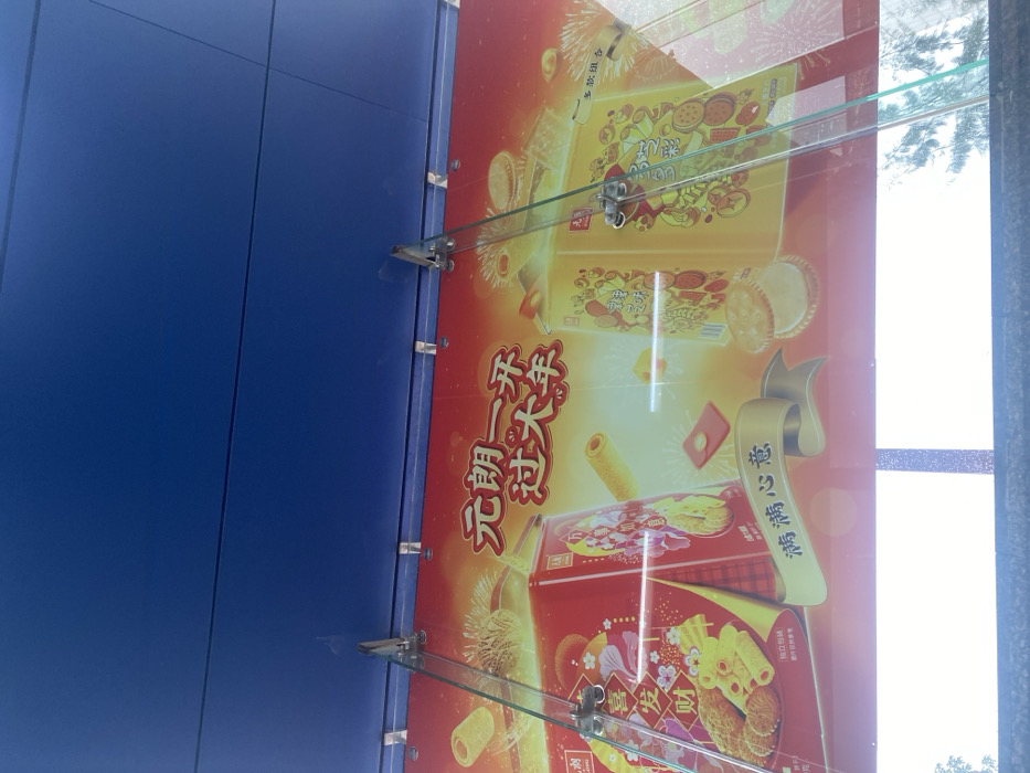 A vertically oriented image features a promotional advertisement. The ad showcases various snack products, including cookie boxes and individual snacks, set against an orange background with golden accents. Chinese text is prominently displayed alongside images of the food items. The advertisement is attached to a blue panel, with visible glass panels and metal fasteners securing it. Natural light filters through from the right side of the frame.