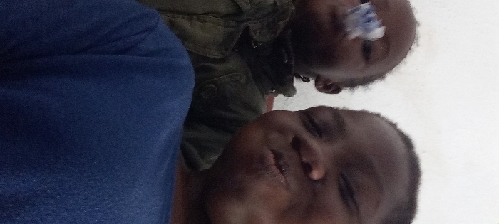 The image depicts two individuals, likely children or young adolescents, positioned closely together in what appears to be an indoor setting with a plain, light-colored wall as the background. The individual on the right is in the foreground, facing the camera with a puckered facial expression. This individual has dark skin and is wearing a blue top, the fabric of which appears textured. Only the upper torso and head are visible. The individual on the left is positioned slightly behind and to the left of the first individual. This person also has dark skin and is wearing a dark green or olive-drab collared jacket. A small, irregularly shaped white object, possibly a wrapper or a piece of tissue, is visible on their nose or upper lip area. Their gaze is not directly at the camera, and their expression is less clear due to the object and slight blur. There are no discernible architectural features, furnishings, or exterior elements within the image to specify a precise location within Ogbomosho, Nigeria. The scene is confined to a close-up of the two individuals against a neutral interior wall.