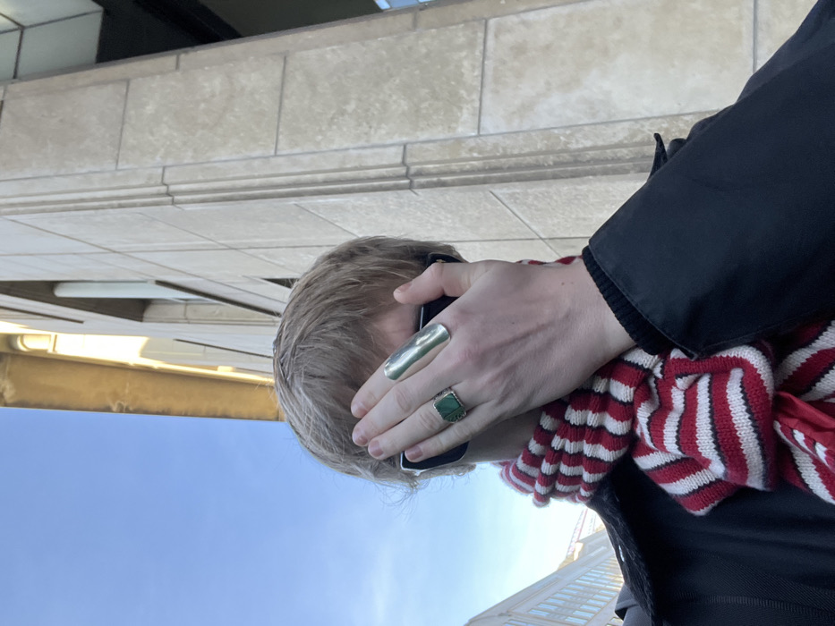 An individual with short, light-colored hair is depicted outdoors in Brussels, Belgium, under a clear blue sky. The subject's face is partially obscured by their raised left hand, which covers the area from the nose to the forehead. Dark sunglasses are visible beneath the hand. The person is wearing a black outer garment, a dark inner layer, and a red and white horizontally striped knitted scarf. The left hand displays two rings: a silver-colored ring with a rectangular green stone on the ring finger and a large, elongated, smooth silver-colored ring on the middle finger. In the background, to the right of the subject, a multi-story building with a light-toned facade, featuring prominent vertical architectural lines and horizontal paneling, is illuminated by direct sunlight. A faint outline of another building is visible in the distant left background.