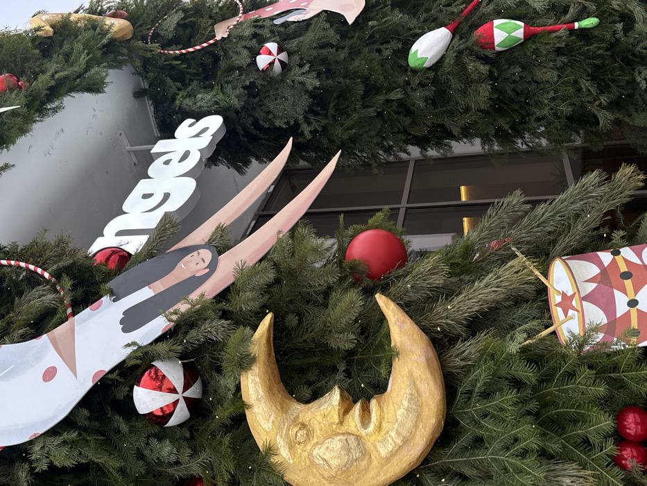 An outdoor festive decoration, likely for a commercial establishment, is captured on a building facade in Yekaterinburg, Russia. The scene is dominated by dense artificial evergreen garlands, adorned with various oversized ornaments and figures. White, three-dimensional block letters spelling "ngels" are affixed above a dark window section, partially obscured by the greenery. Two stylized, elongated figures, resembling angels, are prominent; one wears white pants with red polka dots, and another has dark hair, both appearing to float or descend amidst the foliage. A large, golden crescent moon with a sculpted human face is positioned on the left. Scattered throughout the evergreens are numerous spherical ornaments, including solid red ones and red-and-white striped ones. Decorative elements resembling candy canes are also visible. Towards the bottom, a large, colorful drum ornament with a red star design is present, along with two oversized maraca ornaments, one primarily white and green, the other red and green. Small, white, pin-point lights are subtly integrated into the evergreen branches. The building's dark window panels are visible through gaps in the decorations.