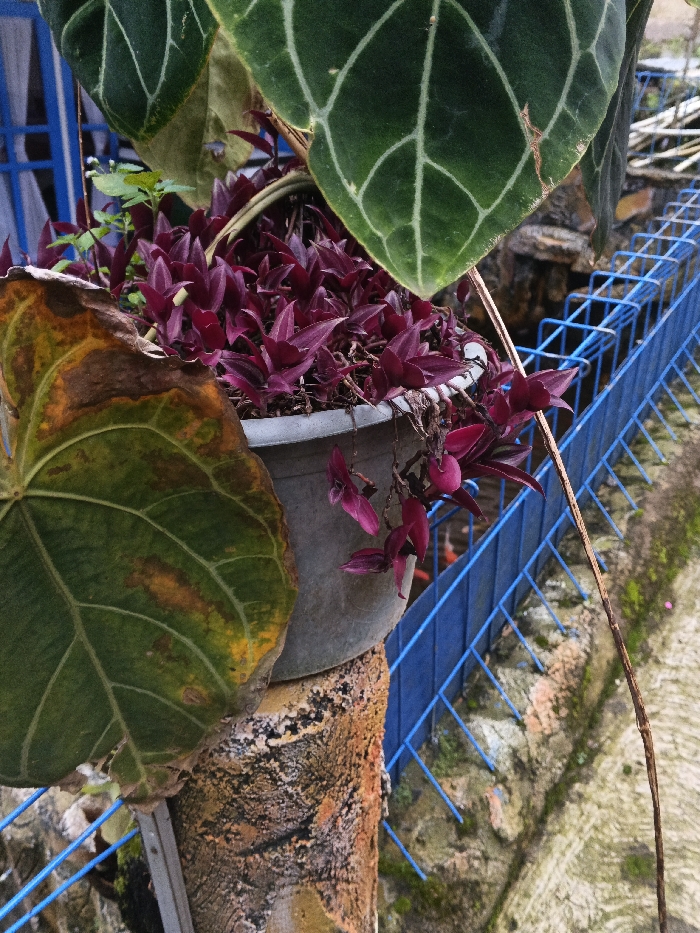 The image presents a close-up, angled view of cultivated plants in an outdoor setting within São Félix do Xingu, Brazil. A gray cylindrical planter, positioned on a mottled brown and orange textured support, contains numerous small plants characterized by dense, reddish-purple, pointed leaves, with some stems trailing over the pot's edge. In the lower-left foreground, a large, green leaf displays significant brown and yellow desiccation. Above the planter, a dark green leaf with prominent light-colored reticulated venation is partially visible. A thin, reddish-brown vine or stem hangs vertically to the right of the central plants. The background features a blue metal grid-patterned fence running diagonally, behind which a concrete surface with green discoloration is evident, along with glimpses of water containing indistinct orange shapes. A light-colored structure with a blue frame is partially visible in the upper-left background. No people are present.