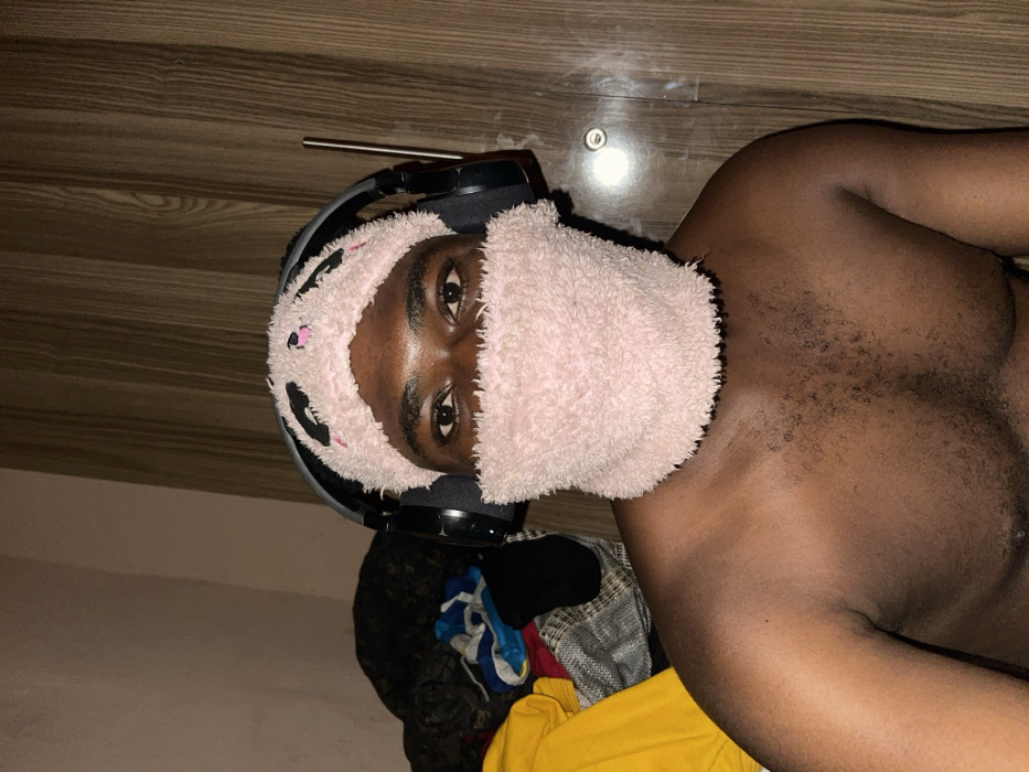 A person with dark skin is depicted from the upper chest, facing the camera. The individual wears a light pink, fuzzy head covering with black and pink panda-like patterns, paired with a matching light pink fuzzy neck gaiter that covers the lower face, leaving only the eyes visible. Black over-ear headphones are worn over the head covering. The subject's bare chest is visible, displaying body hair. To the left of the subject, a pile of clothing items, including yellow, blue, black, and patterned fabrics, is visible against a light-colored wall. To the right, a wooden panel wall or furniture item with vertical grain is present, featuring a circular metallic knob or handle that reflects light, and a thin dark vertical rod. The scene is an indoor setting in Muchiya, Nigeria, illuminated by a direct light source.