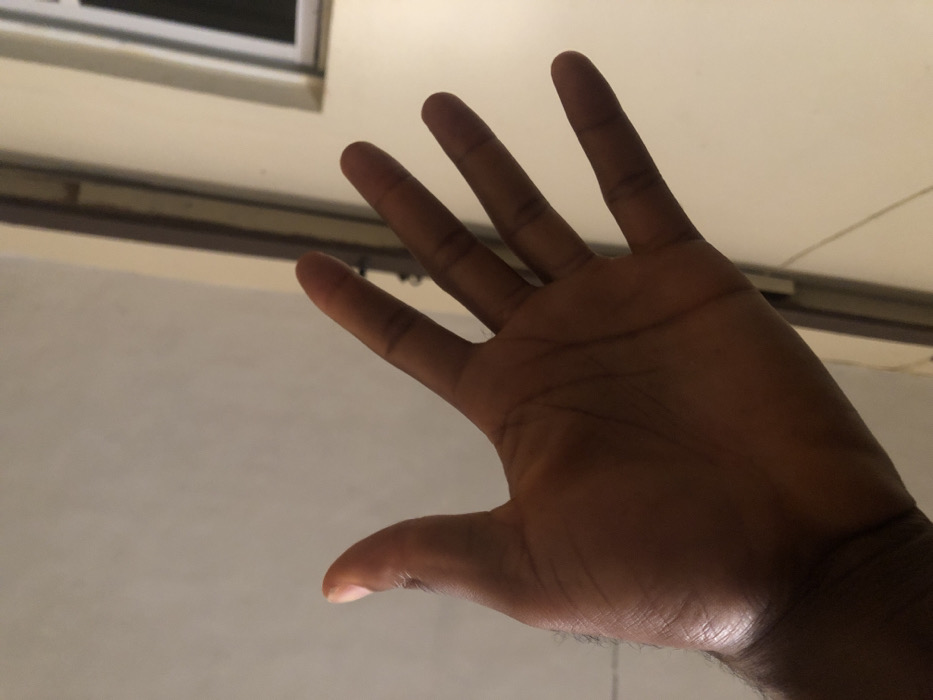 The image displays a human left hand, palm open and facing the viewer, positioned centrally in the frame with fingers pointed upward and slightly splayed. The hand exhibits a dark brown skin tone. Distinct palm lines are visible across the surface. Fine, dark hair is discernible on the dorsal side of the hand and wrist area. The background features a light-colored, plain wall on the left, transitioning to a darker vertical frame, consistent with a door or window frame, on the right. A blurred, light-toned rectangular object, possibly a window, is partially visible in the upper right quadrant. The scene appears to be indoors, under ambient artificial lighting. The specific location in Awka, Nigeria, cannot be determined from the visual evidence present in the image.