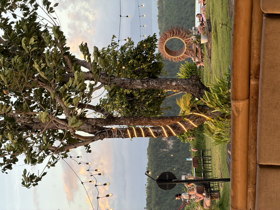 The image depicts an outdoor leisure area at dusk in Sakti, Indonesia, overlooking a bay or sea surrounded by forested cliffs. In the immediate foreground, a bamboo and light-brown cushioned barrier, possibly part of a seating arrangement, extends horizontally across the frame. The midground features a manicured green lawn dotted with various elements. Two prominent trees with visible trunks and green foliage stand near the center, one wrapped with a spiral of illuminated warm-toned string lights. Overhead, multiple strands of string lights with exposed bulbs crisscross the scene. On the left side of the lawn, a black pole with a circular sign stands erect. Behind it, two individuals are seated at a dark table with chairs. One person, with light-colored hair, is seated facing away from the viewer, looking at a phone. Another individual, wearing a dark shirt and a bandana, stands nearby, holding an object resembling a drink or device. Towards the right midground, a large, circular decorative structure made of woven rattan or natural fibers, resembling a stylized sun, is positioned on a wooden base. Adjacent to it, two individuals are reclining on low-level lounge furniture or mats on the grass. One person, wearing a light-colored top, holds a bottle. A white planter pot is situated on the grass nearby. The background consists of dense green foliage covering steep cliffs or hills. Beyond these landforms, a calm body of water is visible. The sky above displays soft cloud formations with hints of pink and orange, indicative of either sunset or sunrise.