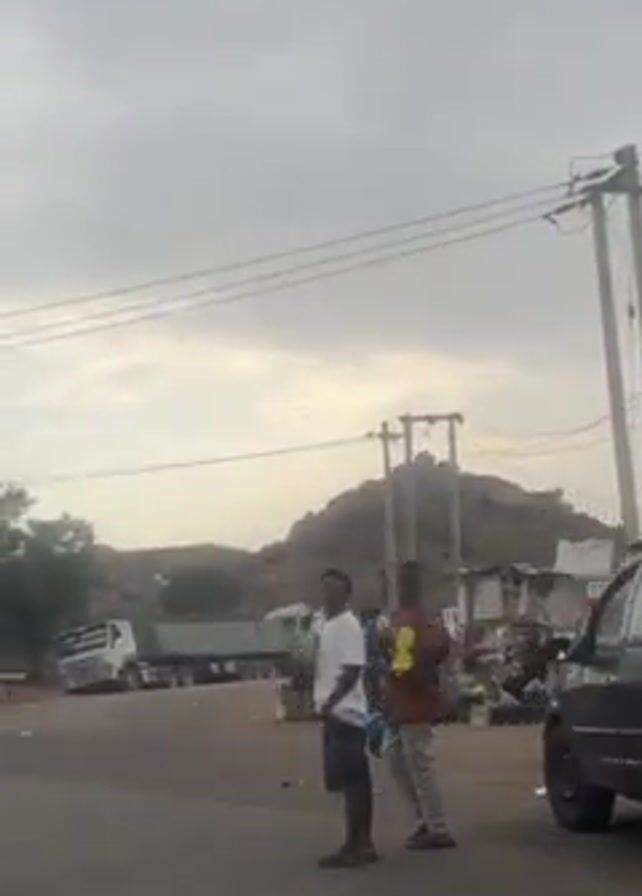 roadside scene with several people milling about near a dark SUV that has its trunk open. Other cars and a police vehicle are also parked nearby. The environment is a somewhat rural area with power lines overhead and a rocky hill in the background. As the video progresses, the perspective shifts from inside a car driving along the road, revealing a line of trucks parked to the side of the road and a person sitting on a curb. The sky is overcast, suggesting a potentially cloudy or rainy day.