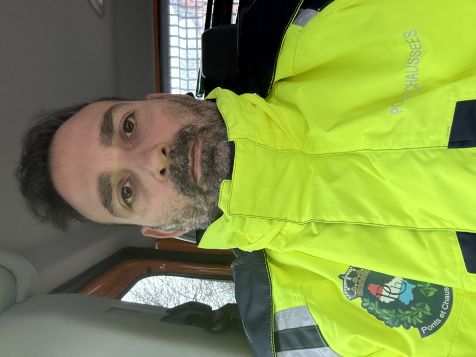 A male individual, appearing to be in his 40s, is depicted in a head-and-shoulders frame inside a vehicle. He has dark, disheveled hair, a full dark beard, and brown eyes, staring directly forward with a neutral expression. He is wearing a high-visibility neon yellow-green jacket with dark grey/black accents on the shoulders and sides, featuring reflective strips. On the left chest, a circular emblem displays a crown above a map-like image, with the text "PONTs et Chaus" below. The right chest area shows "PONT ET CHAUSSEES" in reflective lettering. The background reveals the interior of a vehicle, consistent with a work truck or van, featuring a light grey ceiling and an orange-brown door frame on the left. Outside the left window, bare tree branches are visible against a light sky. Behind the individual's right shoulder, a grid-like pattern suggests a rear window or partition. The scene is located in Wasserbillig, Luxembourg, identifying the subject as likely associated with the "Administration des Ponts et Chaussées."