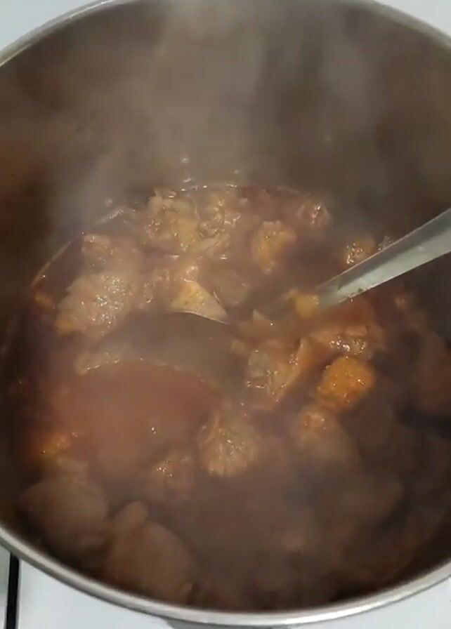 large stainless steel pot on a white stovetop, filled with a brown stew. A metal spoon is used to stir the stew, which consists of small pieces of meat in a thick sauce. Steam rises from the pot. There is a glimpse of a blue and white patterned plate near the bottom of the frame. The stovetop and surrounding countertop are white.