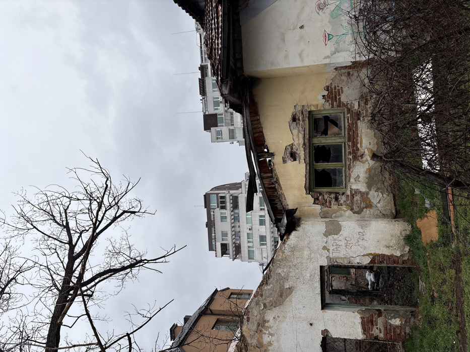 This image depicts a scene in Sofia, Bulgaria, characterized by urban decay juxtaposed with modern development under an overcast sky