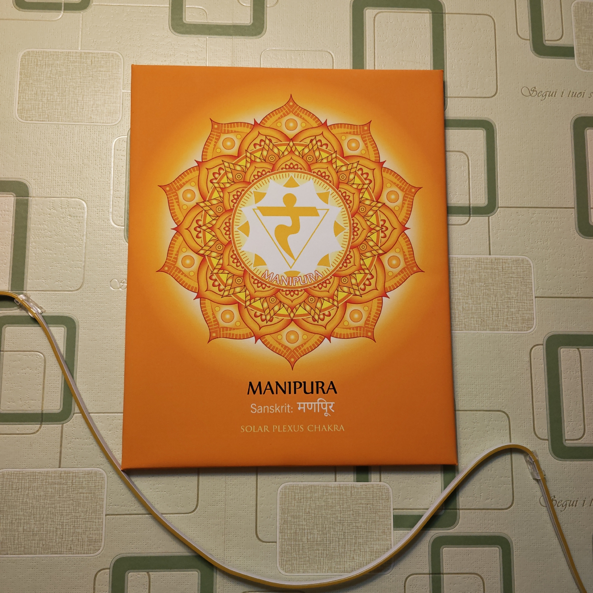 A square orange canvas print featuring a detailed chakra mandala is centered on a light green and beige wallpapered surface. The print displays the word "MANIPURA" in bold, capital letters, followed by the Sanskrit translation and the phrase "SOLAR PLEXUS CHAKRA". A flexible, white and yellow strip light is tacked to the wallpaper around the print. The wallpaper is patterned with beige rectangles and dark green square outlines, also there is some text on the right corner of the wallpaper. The image presents a close-up, indoor setting. The location is not provided in the image.