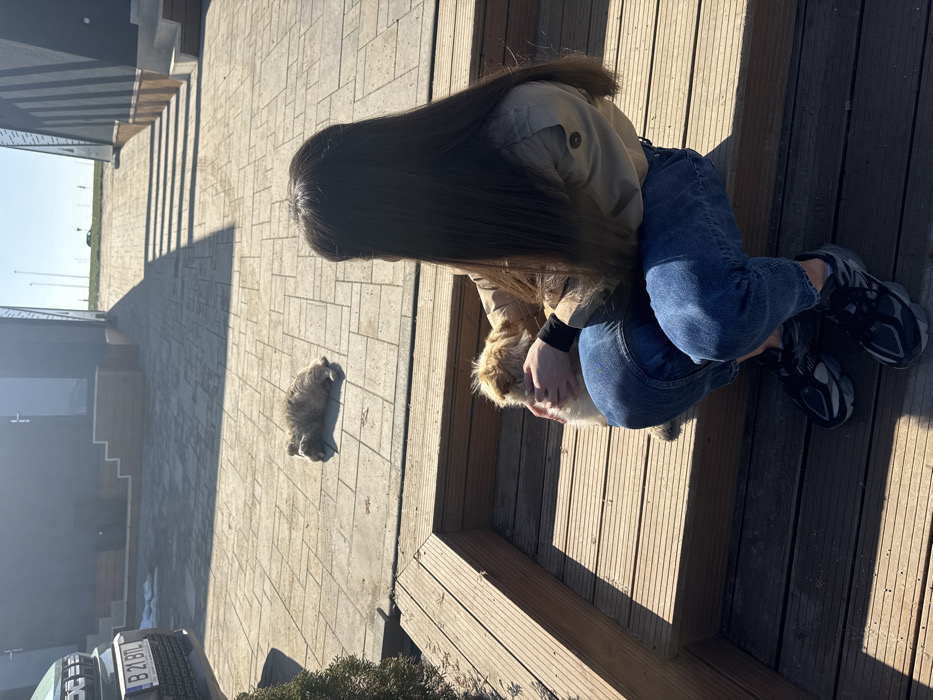 The scene depicts an outdoor setting in Căciulați, Romania, on a clear, sunny day. A female individual, seen from behind, is seated on a multi-tiered wooden deck or steps in the foreground. She wears blue jeans, a light tan jacket over a dark long-sleeved shirt, and black and grey athletic shoes. She is actively petting a small, light brown, fluffy dog that sits beside her on the wooden structure. In the mid-ground, a tabby-patterned cat is lying prone on the light-colored rectangular paver-covered ground, appearing to bask in the direct sunlight. Behind the paved area, two modern buildings with dark facades and light-colored doors are visible, each featuring small sets of white steps leading to their entrances. To the far left, a dark-colored Dacia vehicle with a Romanian license plate "B 21 BTL" is partially visible, parked on the pavers, with a small patch of melting snow nearby. The background reveals an open, upward-sloping paved area leading to a distant horizon under a clear blue sky, with faint structures and possibly a vehicle visible in the far distance. Strong sunlight casts distinct shadows across the paved surface and from the buildings.