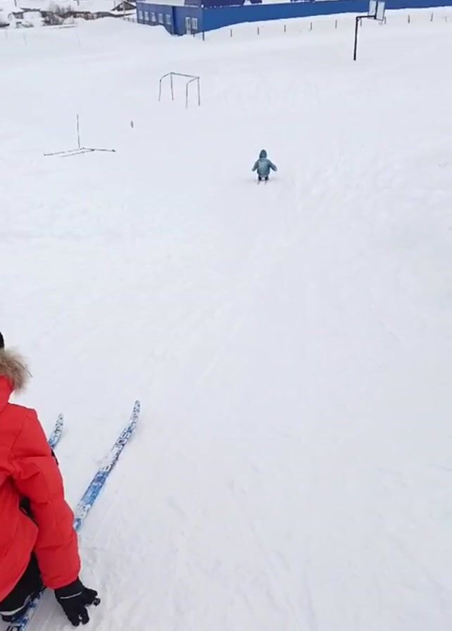 A person in a red winter coat sits on skis in the foreground of a snowy scene. Another person, wearing a light-blue winter coat, is further away in the snow covered field. They appear to be moving in a seated position. Behind them, in the distance, there is a large blue and white building. The sky is overcast.