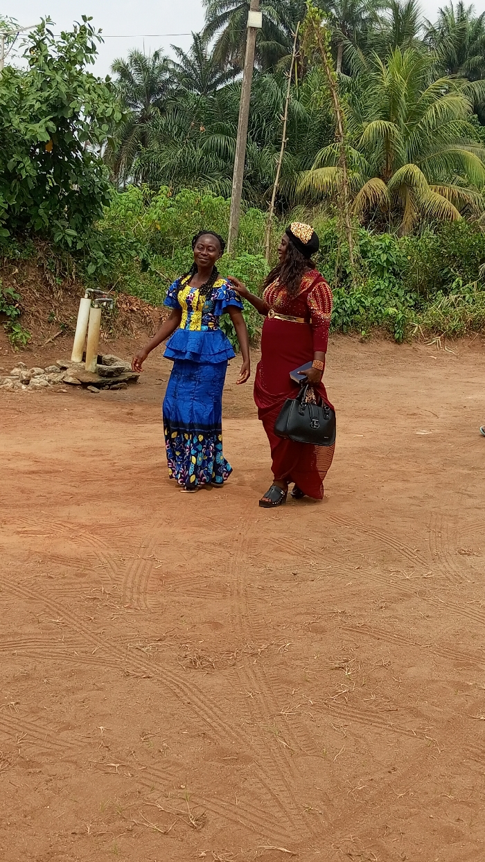 The image captures two adult females standing on an unpaved, reddish-brown dirt surface in an outdoor, vegetated environment within Agburu Uke, Nigeria