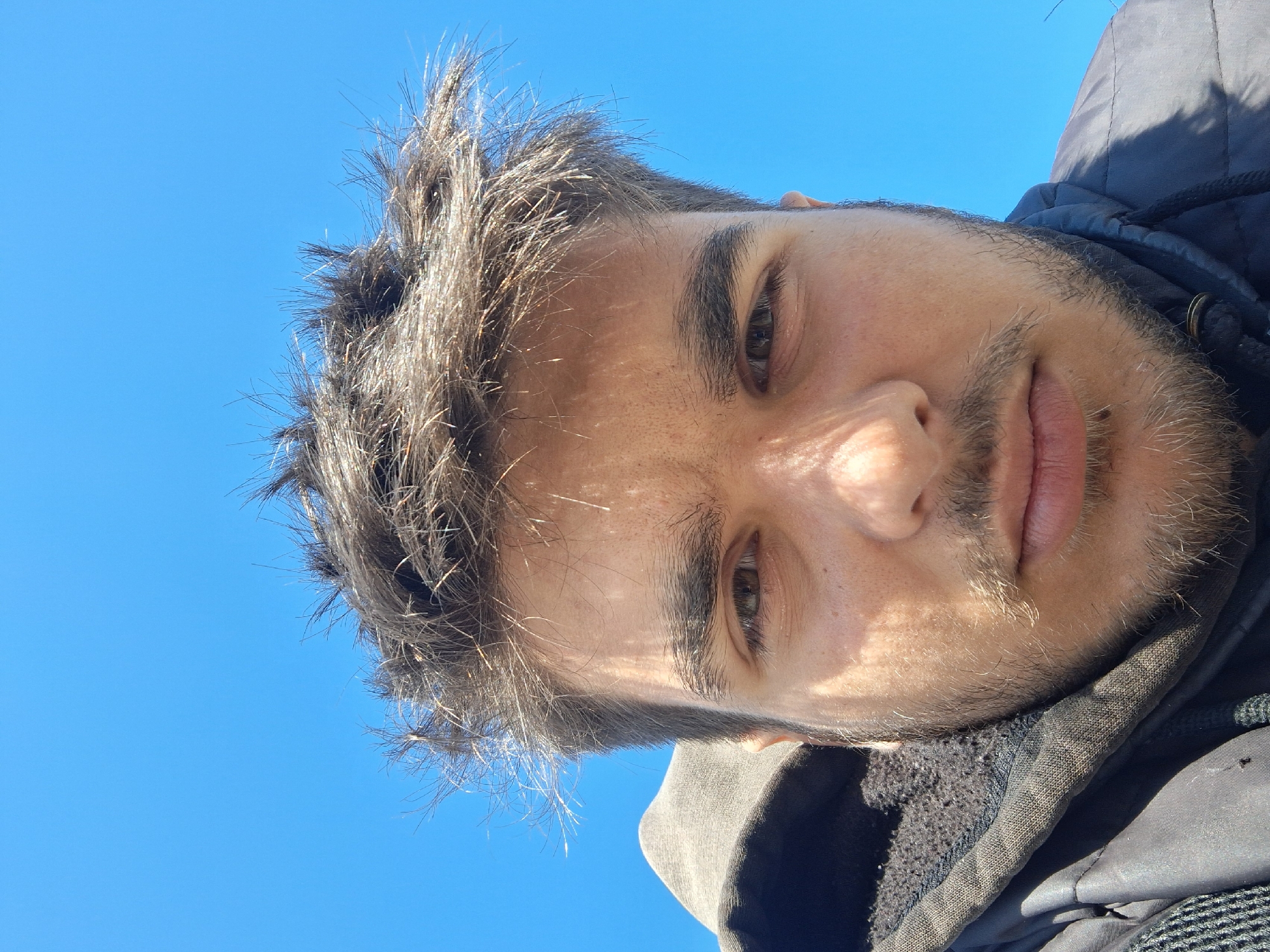 A man is pictured from a low-angle perspective against a bright blue sky. He has short, dark hair with some lighter strands. His skin tone appears to be light to medium. He has dark eyes, eyebrows, and a stubbly beard. He wears a black jacket, the collar of which frames his face. The light source seems to be above and slightly to the right of the man, casting shadows on his face. The exact location within Varna, Bulgaria cannot be determined from the image.