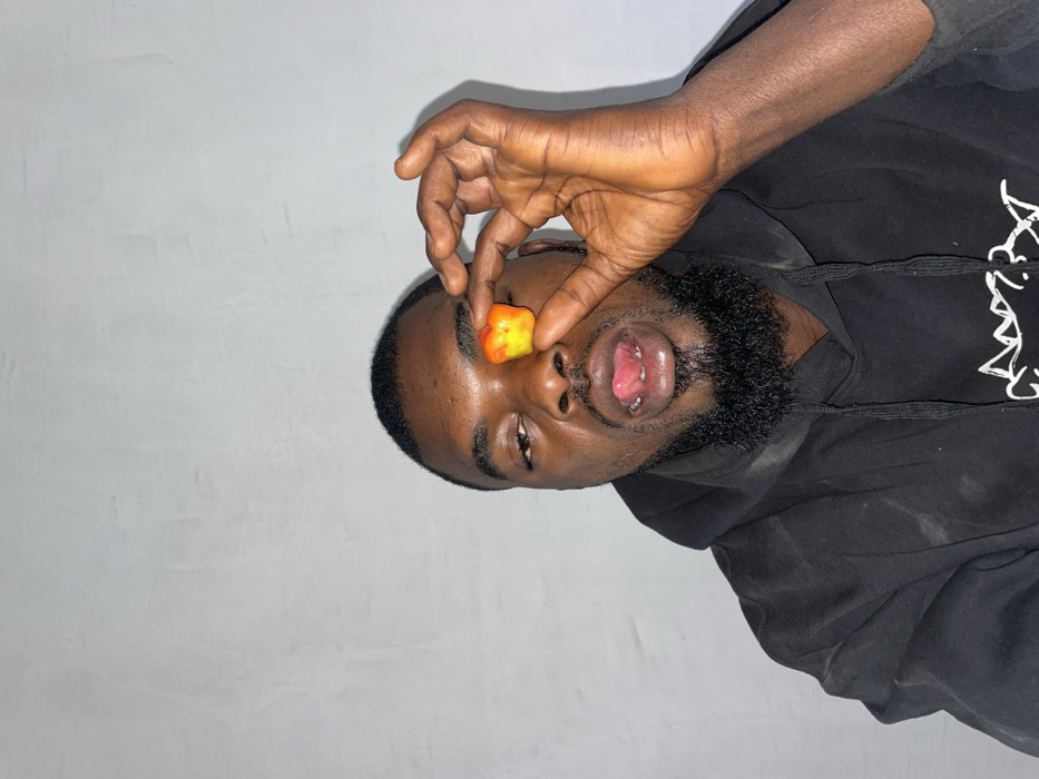 A man with a beard and black hoodie holds a small, yellow and red object between his fingers. The object is positioned over his eyebrow, with his eye peeking out from behind it. His mouth is open, revealing his tongue and teeth. He is in front of a gray wall, and the image is rotated.