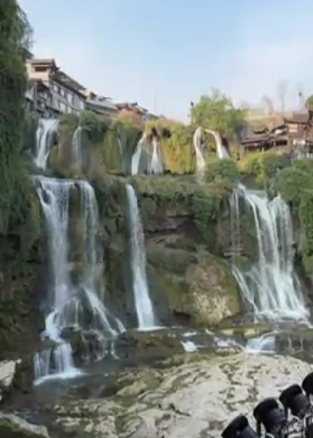 A wide, stationary shot showcases a cascading waterfall against a clear, blue sky. The multi-tiered waterfall flows over mossy rocks into a shallow, rocky riverbed. Chinese-style buildings with dark, upturned roofs are visible on the high ground flanking the waterfall. In the foreground, a row of black lights is situated on a grassy area. The scene appears calm and serene.