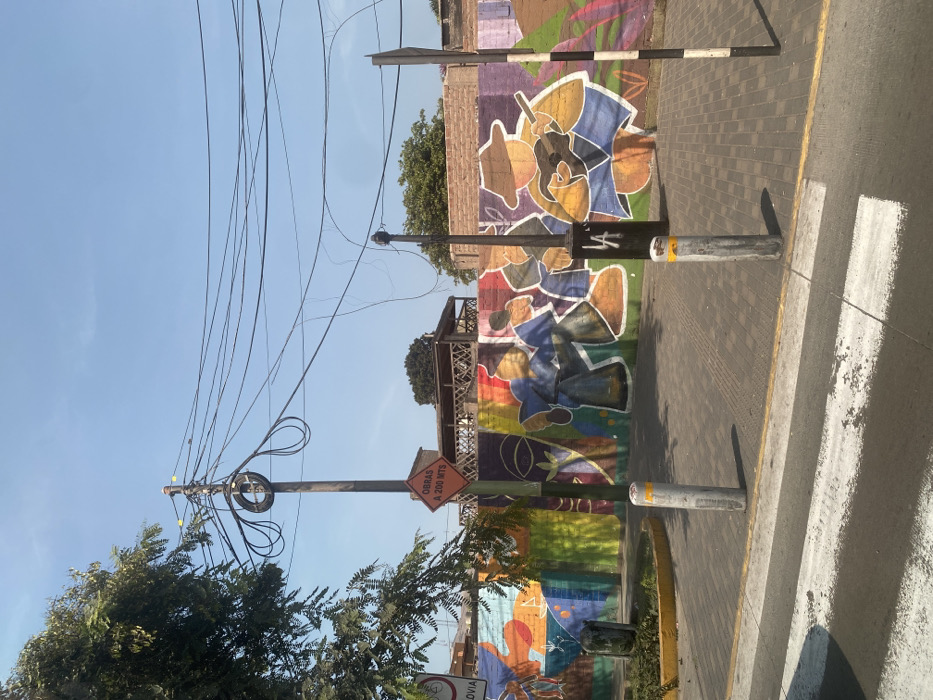 street scene in Chorrillos, Peru, located at the coordinates -12.166, -77.027. A wall with colorful murals depicting stylized figures is visible. The figures are in a playful, almost cartoonish style, suggesting a festive or celebratory theme. The wall appears to be made of brick and is surrounded by a sidewalk. A streetlight and several power lines are present overhead. A street sign in the background states “OBRAS A 200 MTS”. This suggests that construction is taking place nearby. The street is paved with gray bricks. The image is taken from a pedestrian's perspective. The scene is brightly lit by the sun. There are no people visible in the scene. There is a tree in the foreground on the left side of the image. The image appears to have been taken during the day.