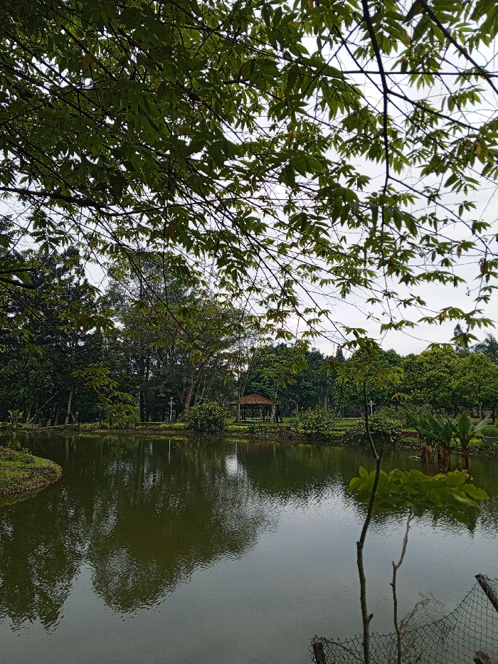 A serene pond reflects the surrounding foliage. Various trees line the water's edge, with branches extending overhead, partially obscuring the sky. In the distance, a small gazebo sits nestled among the greenery. The water's surface is rippled, suggesting a gentle breeze. A thin tree and part of a wired fence are visible in the foreground.
