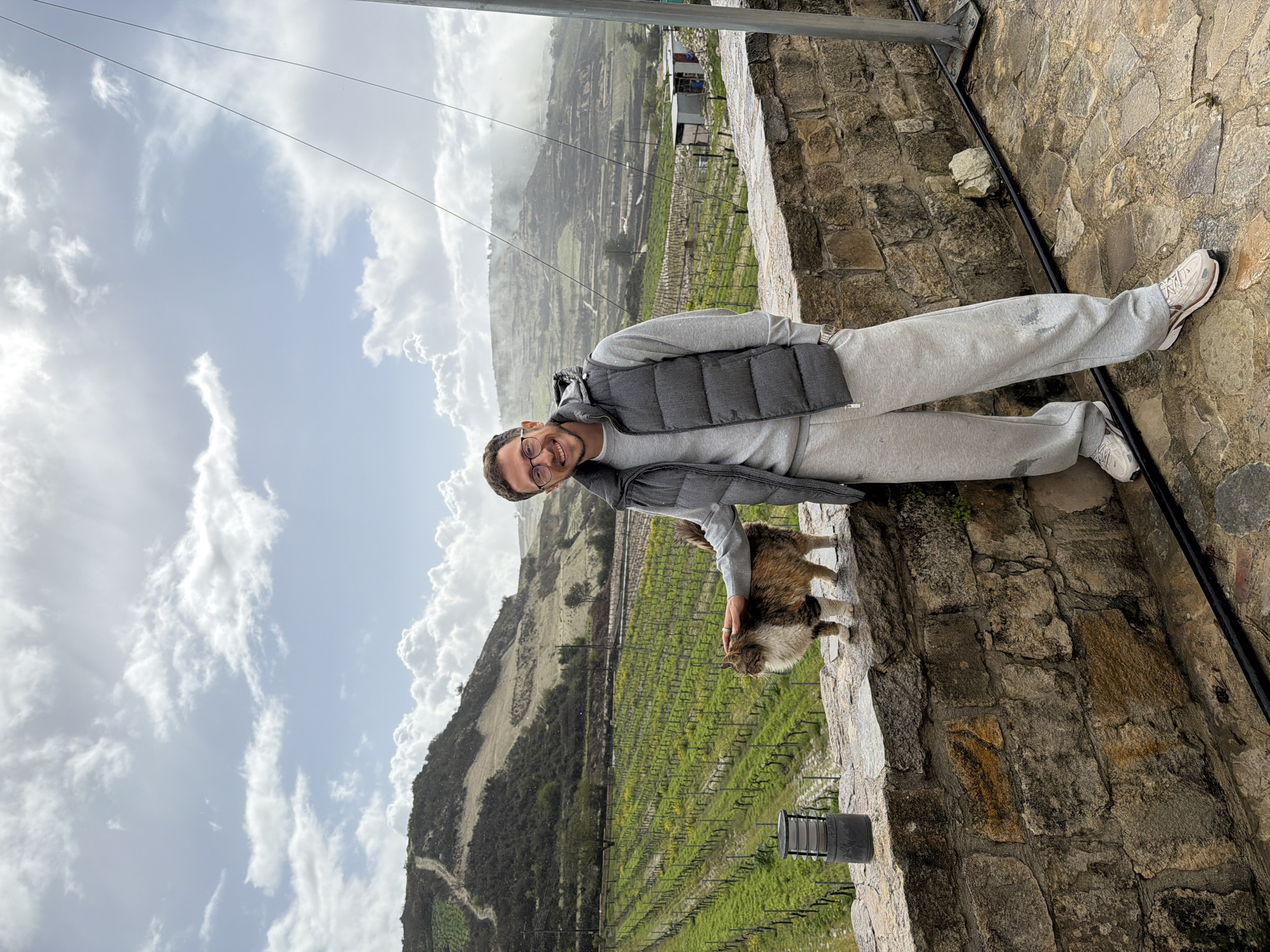 A man in athletic clothing stands on a stone wall in Omodos, Cyprus, interacting with a multi-colored cat. He wears glasses and a gray puffy vest. The cat is on the wall in front of him. The background shows terraced fields, vineyards, and a cloudy sky.