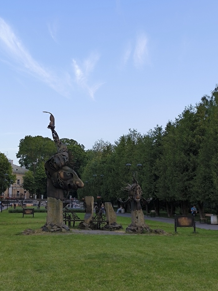 Two bronze sculptures with human-like faces stand in a grassy park under a clear blue sky
