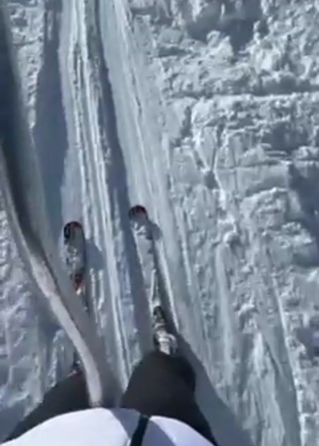 person skiing uphill using a ski lift. They are wearing skis, dark pants, a white jacket, a black helmet, and blue goggles. The person is holding onto a gray pole for support as they are pulled uphill on a snow-covered slope. The sun is shining, and the sky is blue. There are tracks in the snow and some trees visible in the distance. The video is filmed from the person's point of view.