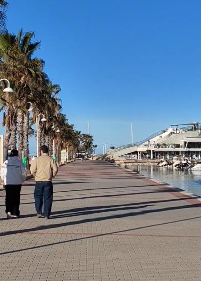 Two people are walking away from the camera on a brick-paved walkway. The person on the left is wearing a white hooded sweatshirt and dark pants. The person on the right is wearing a tan jacket and blue jeans. Palm trees line the walkway on the left, casting long shadows. On the right, there's a body of water with a modern, multi-level building in the background. The sky is clear and blue. The general atmosphere appears calm and peaceful.