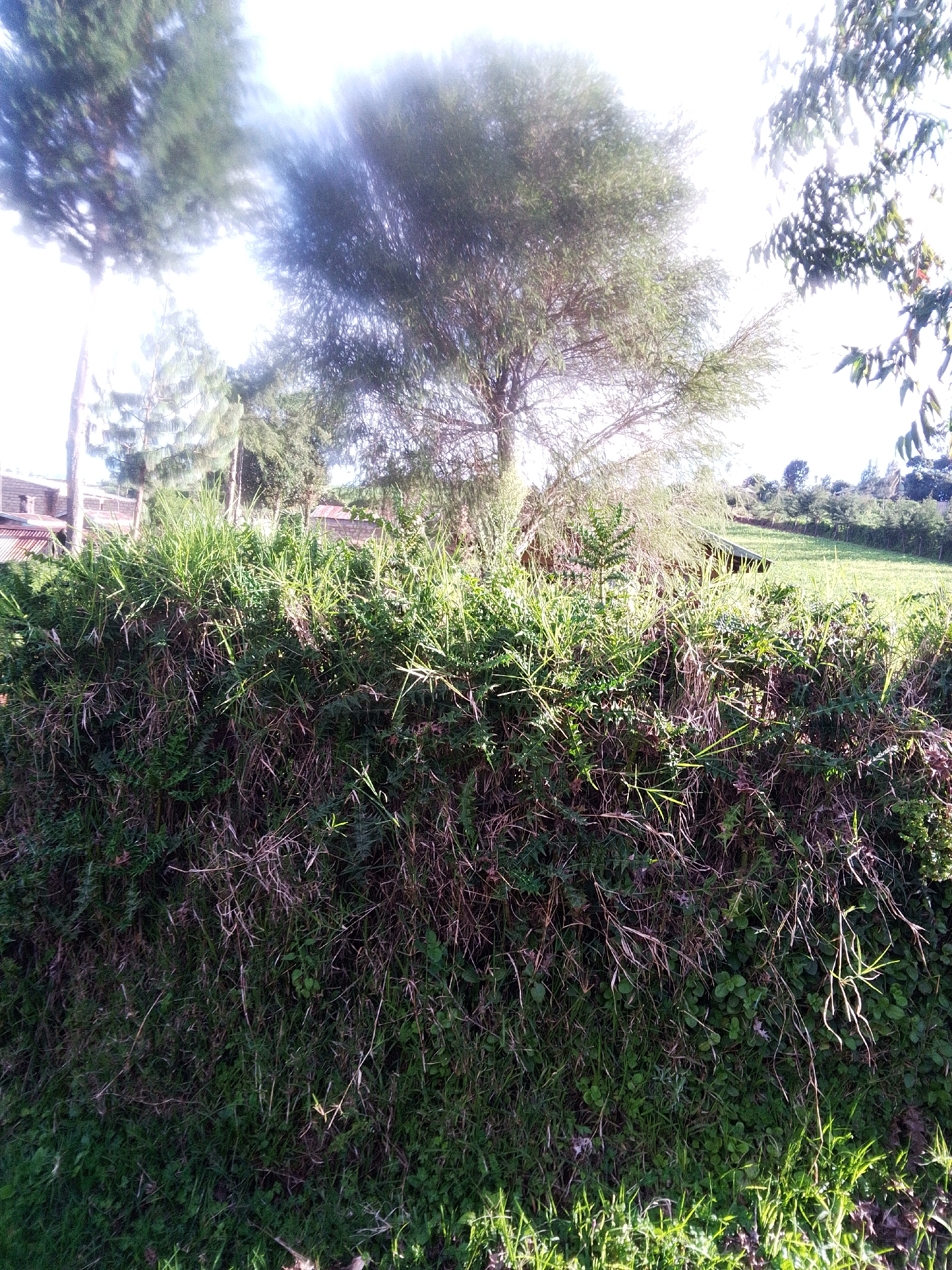 The image depicts a lush, green scene, likely in Bibirioni ward, Kenya. In the foreground, a dense hedge or thicket of vegetation dominates the view, with various grasses, shrubs, and leafy plants intertwined. Some dead or dried plant material is interspersed within the greenery. Beyond the hedge, there's a slightly elevated grassy field. Trees are visible in the background, their canopies extending into the sky, which appears bright and somewhat overexposed. In the distance, hints of buildings or structures are visible among the trees. The scene is bathed in sunlight, creating highlights and shadows within the vegetation.