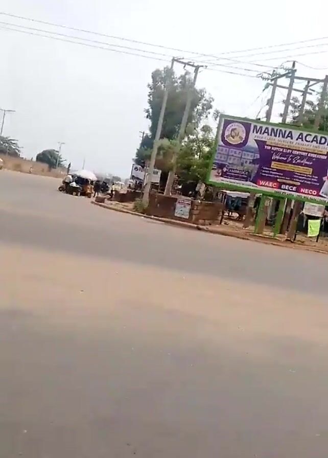 street intersection in an urban area, likely in Nigeria, based on the visible signage. The camera is moving, possibly from inside a vehicle. Along the side of the road, there are various billboards and street vendors. The billboards display advertisements, including for a school called "Manna Academy," and political figures. There are people walking along the side of the road, and a yellow tricycle taxi drives past. The day appears overcast. Power lines are visible overhead.