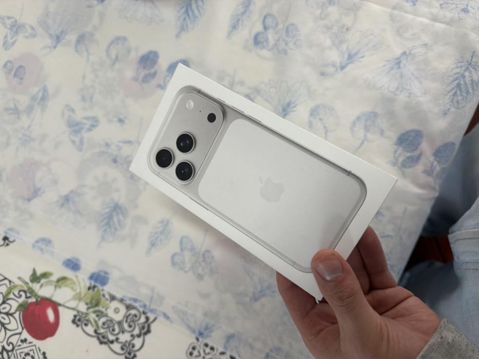 In the city of Vila Real, Portugal, a left human hand, with light skin tone and short fingernails, is depicted holding a white Apple iPhone box. The box displays a detailed image of the back of a silver-colored iPhone, featuring a triple-lens camera system, an additional sensor, and the Apple logo. The hand extends from above light blue denim trousers. The immediate background comprises a white fabric with a light blue floral and leaf pattern. To the upper left, another distinct white fabric is partially visible, adorned with intricate black patterns and a prominent red tomato illustration with green foliage.