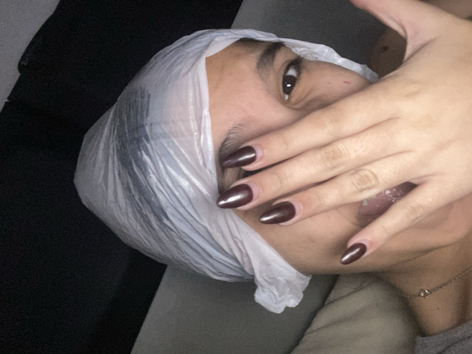 The image displays a person indoors, in Cotoperíz, Venezuela. The subject, who has a medium skin tone, is positioned against a dark, indistinct background, with a lighter, cushioned surface visible to the left. A translucent white plastic bag covers the subject's head, with dark hair visible underneath. The subject's left hand, featuring almond-shaped nails painted dark burgundy with a light base at the cuticles, is placed over the lower half of the face, obscuring the mouth and chin. A portion of the mouth or tongue is visible between the fingers. The subject's right eye is open and directed towards the viewer. A gray garment is visible on the lower left side of the frame, along with a thin silver necklace adorned with a small charm.