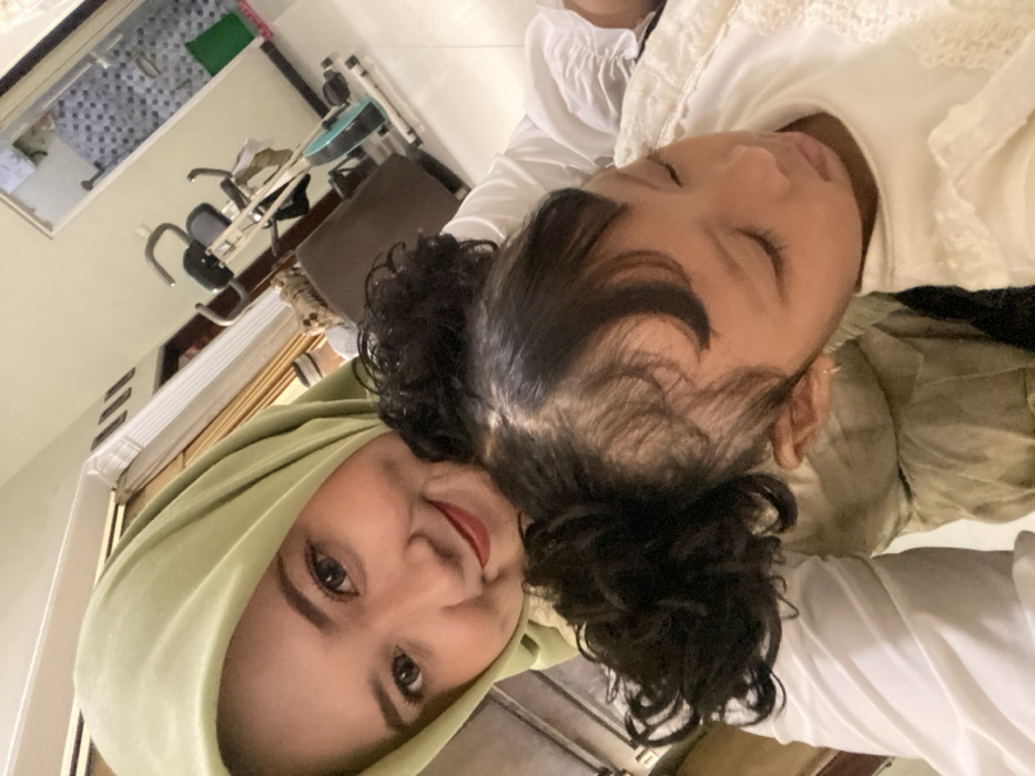 A selfie captures a woman in a light green hijab next to a sleeping child. The child, wearing a white outfit, has dark curly hair styled in pigtails. The background shows a home interior with exercise equipment and a window. The woman looks at the camera, creating an intimate and tender scene.