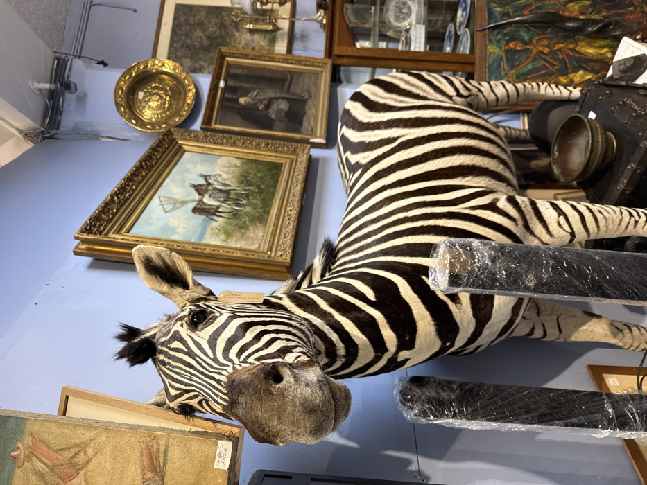 This image captures an indoor scene within an establishment resembling an antique shop or curios showroom, situated in Brussels, Belgium. The primary subject is a full-body taxidermied zebra, positioned centrally, facing slightly left with its head turned to look directly forward. Its characteristic black and white stripes cover its entire visible body. The background features a light blue wall densely covered with various items. To the upper left, a vertically oriented painting in a light wooden frame is partially visible. To the right of the zebra's head, a prominent oil painting in an ornate gold frame depicts two donkeys or mules in a pastoral landscape under a light blue sky, with a net-like structure in the distance. Below this, a smaller, dark-framed oil painting portrays an older man seated. A circular, embossed brass plate hangs on the wall above the smaller painting. Further to the right, a tall, wooden display cabinet with glass doors showcases numerous porcelain plates and decorative items. Brass objects, resembling candlesticks, are visible on top of this cabinet. In the lower right corner, a dark-framed artwork, possibly a painting or print, displays vibrant, stylized figures. In the foreground, two tall, dark, cylindrical objects, wrapped in clear plastic film, stand vertically, partially obscuring the lower body and legs of the zebra. Below the zebra's midsection, a dark, possibly metal-bound chest or trunk serves as a stand for a dark, glazed ceramic bowl. The ceiling is visible at the top of the frame, revealing exposed white electrical conduits and utilitarian ceiling panels. The lighting within the space appears to be artificial, illuminating the array of displayed objects. No people are visible within the frame.